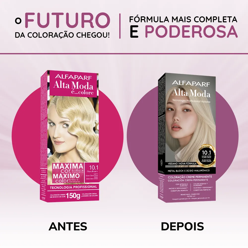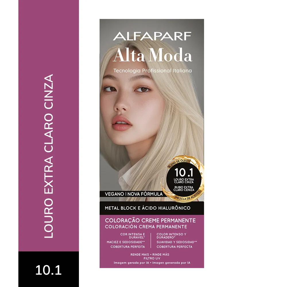 Máxima brilho, cor e tratamento. Alta fixação, extra cobertura e cores ultra modernas. Experimente o Alfaparf Alta Moda 10.1 Louro Extra Claro Cinza da próxima vez que for mudar a cor do seus cabelos.
