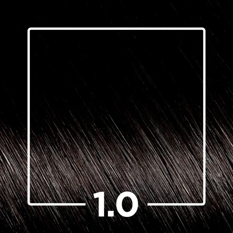 Preto Absoluto e Vibrante: A nuance 1.0 Preto garante uma cor intensa, uniforme e duradoura, agindo no córtex capilar para fixar os pigmentos com excelência.